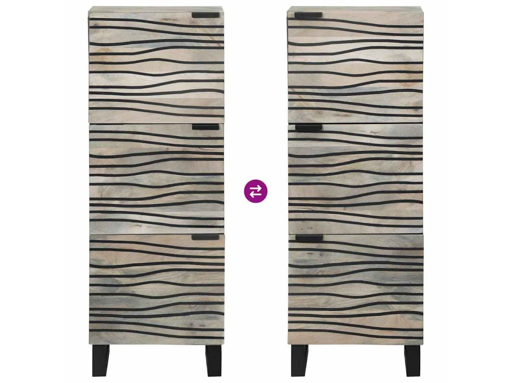 - Materiály: Vysoká skříň je z odolného solidního mangového dřeva, což zajišťuje, že bude vypadat skvěle i po letech. Dřevěná konstrukce dodává pevnost a dlouhou trvanlivost.
