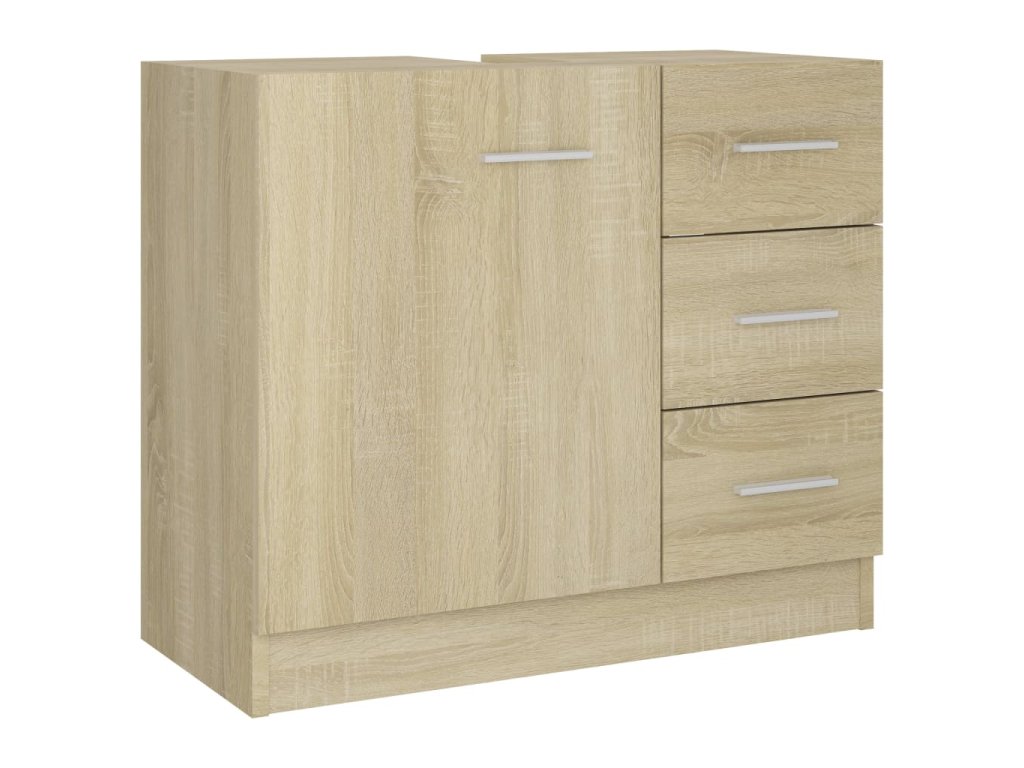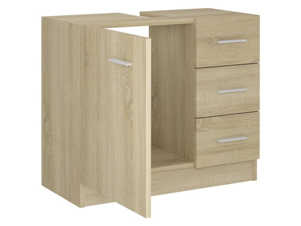 Skříňka je vyrobená z kompozitního dřeva, takže je pevná a stabilní. Obsahuje 1 přihrádku a 3 zásuvky, nabízí tedy celou řadu úložných možností a dodatečné místo, kam uklidit vaše koupelnové potřeby. Horní deska je zase ideálně uzpůsobená k umístění umyvadla. Skříňku snadno očistíte navlhčeným hadříkem.