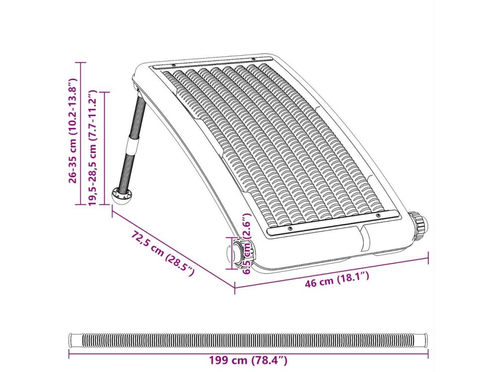 Solární ohřevný systém je vyrobený z materiálů, které výborně vzdorují častému vystavení slunci a povětrnostním podmínkám. Zakřivené panely pro ohřev bazénu a nastavitelné nohy zajišťují maximální plochu pro zachycení sluneční energie, což také znamená vyšší účinnost ohřevu.