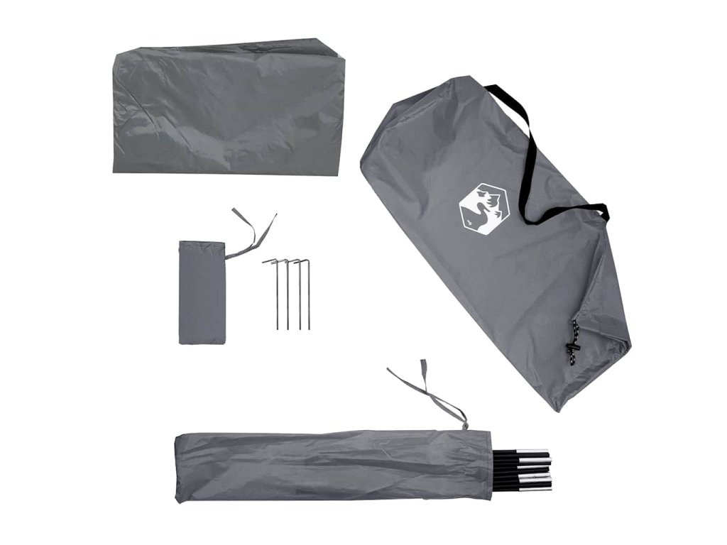 - Snadné sestavení: Stan je vybaven pevnými tyčemi a popruhy, které jej snadno ukotví k zemi a připojí k autu, takže není nutné hledat kameny nebo jiné těžké předměty k jeho zajištění.