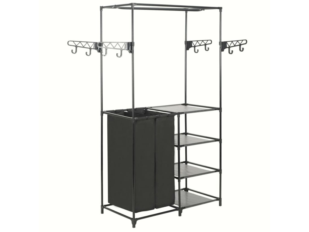 Má trubkový rám z práškově lakované oceli, který je lehký, ale přitom robustní, lze jej tedy snadno přemisťovat a zároveň je i velmi stabilní. Je vybaven dvěma prostornými pytli a čtyřmi policemi, jež jsou vyrobeny z netkané textilie a umožní vám skladovat vaše tašky, boty či menší předměty přehledně uspořádané a po ruce. Disponuje rovněž čtyřmi postranními rameny s háčky, které vám poskytnou dodatečný úložný prostor pro delší oděvy jako jsou kabáty a bundy.