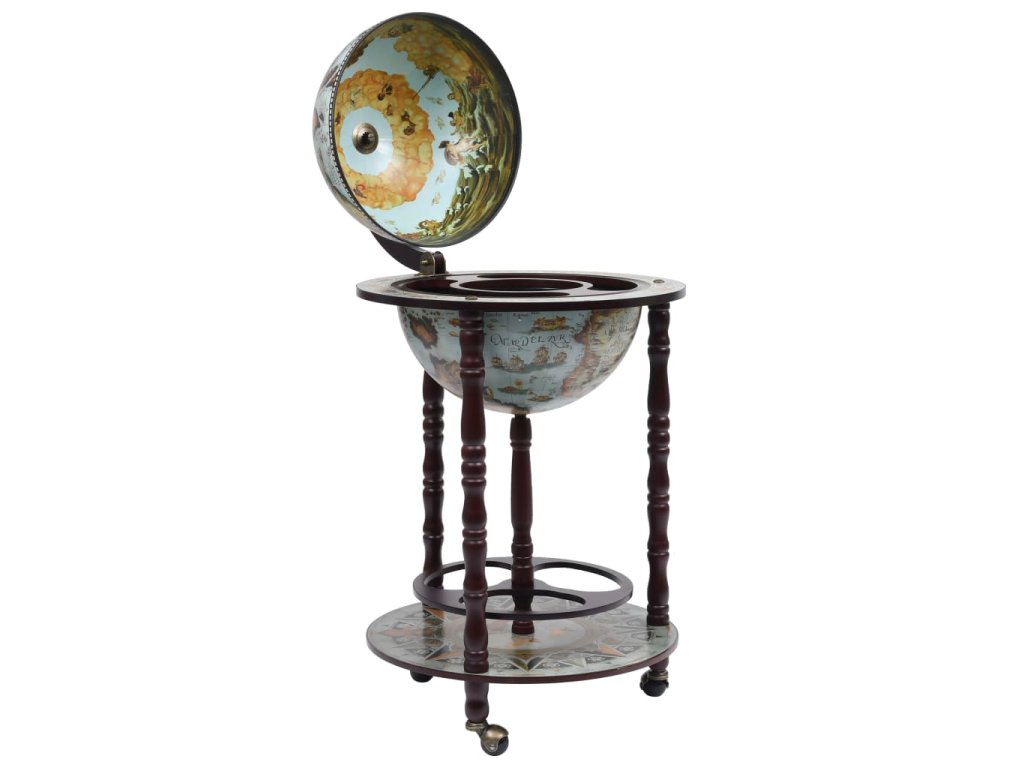 Tento globus bar stojí na kolečkách, takže je snadné ho přemisťovat. Globus představuje starobylou mapu světa. Je vybavený držáky na lahve a sklenice, výborně se proto hodí pro ukládání hned několika lahví a sklenic. Upozorňujeme, že lahve ani sklenice nejsou součástí balení.