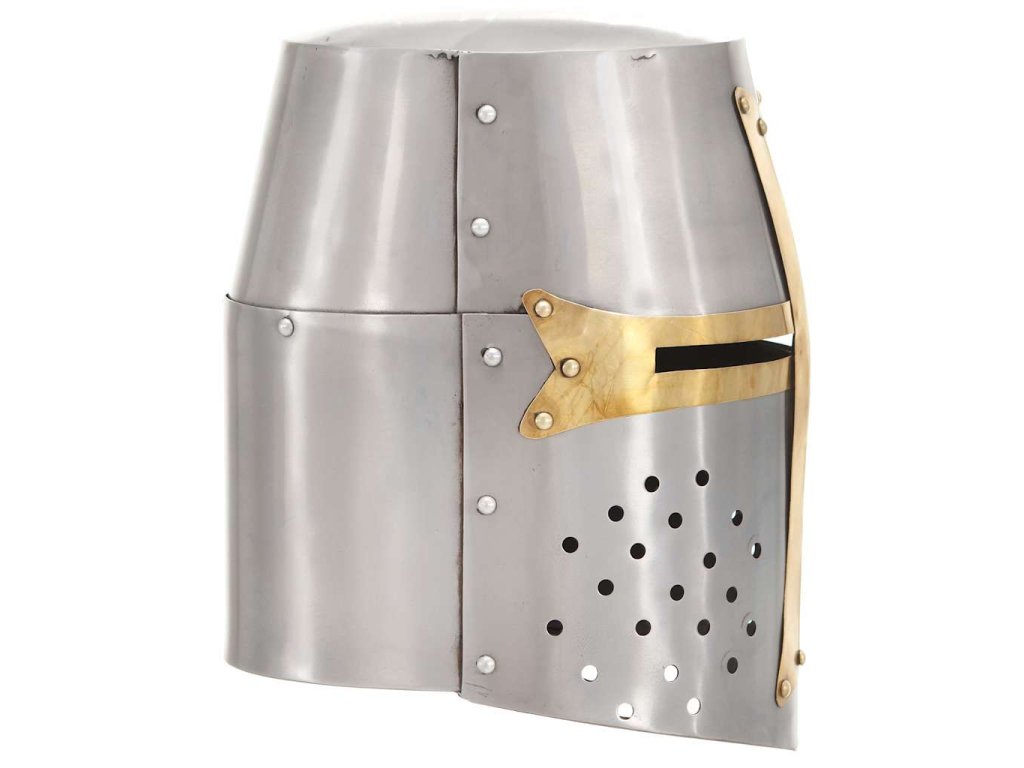 Rytířská helma je přesná replika původní křižácké rytířské helmy. Je zhotovená z oceli 18. Kombinací původního designu s odolným materiálem vznikla působivá helma, která dokonale doplní vaši stávající rytířskou výbavu. Přilba je plně nositelná a zaručuje excelentní ochranu. Malé otvory a průzory slouží k ventilaci a dobrému výhledu. Jedná se také o působivý výstavní kousek.