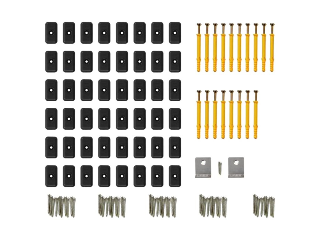 Balení obsahuje 108 podlahových prken na terasu, 36 svorek na první a poslední prkno, 864 plastových oddělovačů, 864 šroubů z nerezové oceli, 324 plastových hmoždinek pro rozpínací šrouby, 324 rozpínacích šroubů z nerezové oceli, 36 šroubů (4 x 25 mm) a 54 nosníků.