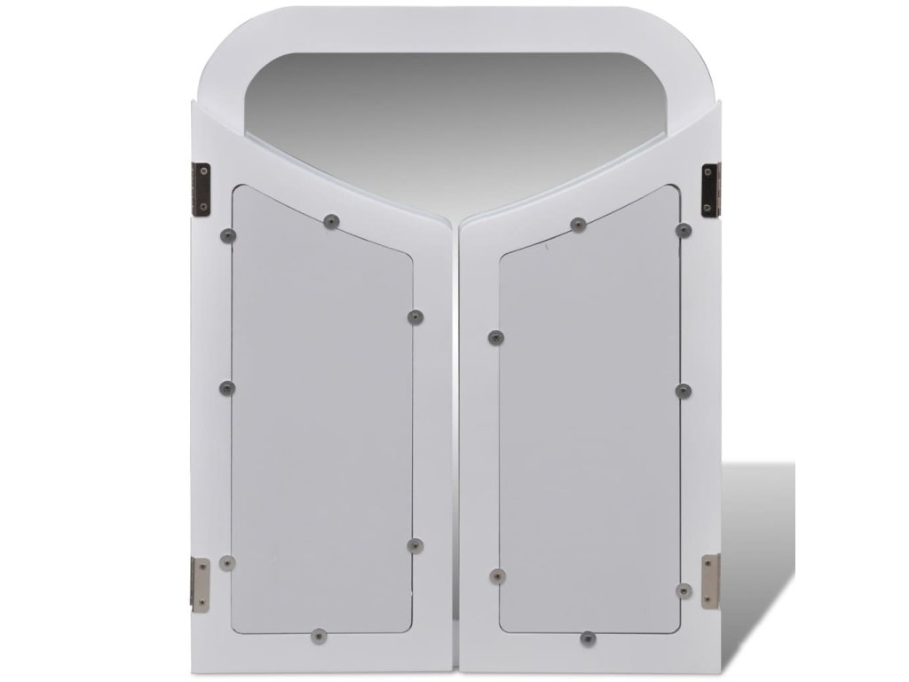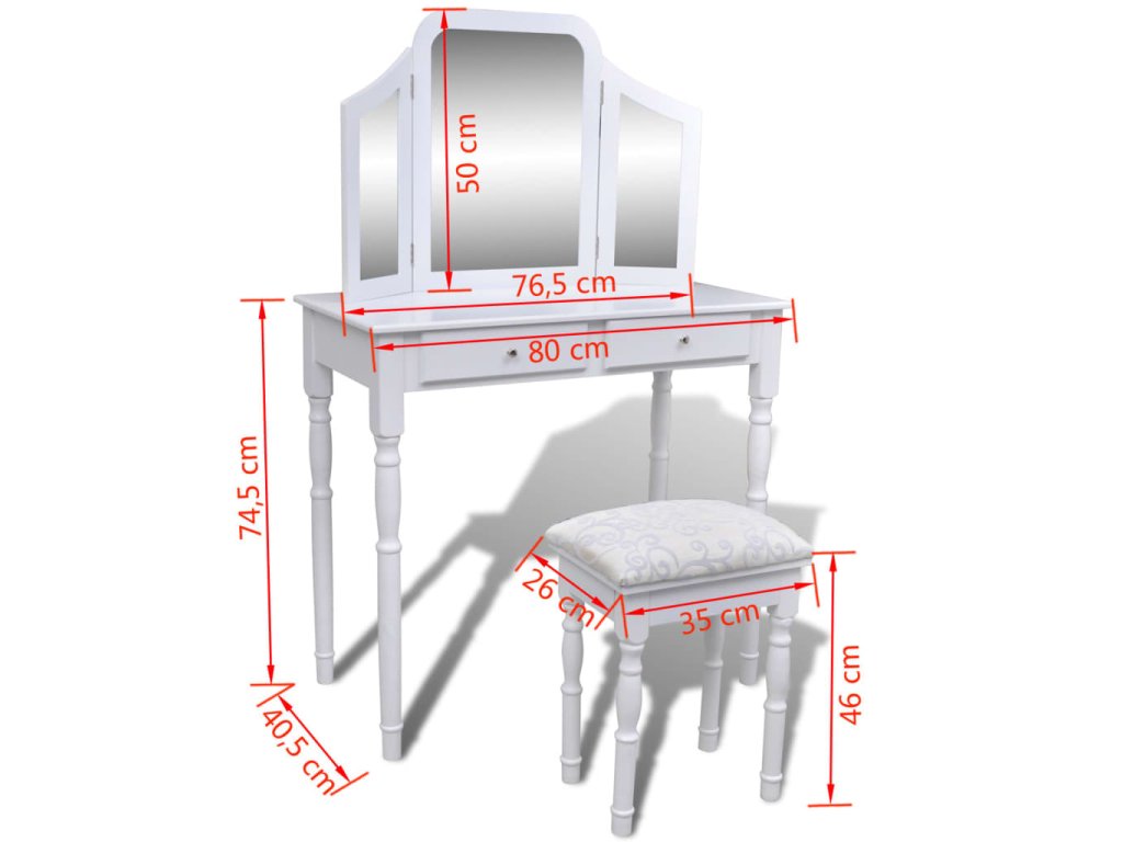 Je opatřen zrcadlem 3 v 1. Po stranách hlavního zrcadla jsou umístěna dvě zrcadla, která jsou připevněna k hlavnímu zrcadlu odolnými panty. Proto je možné je natočit do vámi požadovaného úhlu. Překvapí vás, že zrcadlo a stolek mohou být používány odděleně. Ve stolku jsou dvě zásuvky, které slouží jako další úložný prostor na vaše šperky, kosmetiku nebo vaše osobní věci. Ať už se ho rozhodnete umístit kamkoliv, jistě se stane středem pozornosti.