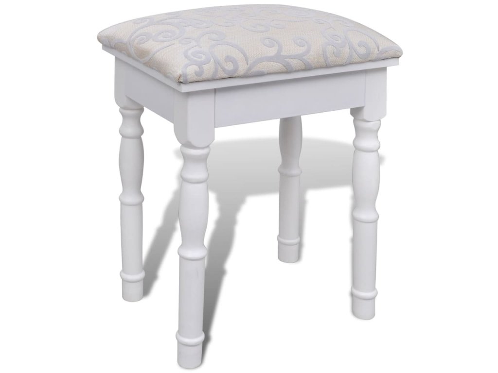 Tento okouzlující toaletní stolek se stoličkou je vyroben z vysoce kvalitního borového dřeva. Jeho viktoriánský styl a čistě bílá povrchová úprava vnesou do vašeho budoáru či šatny eleganci a krásu. Exkluzivní řemeslné zpracování je dalším z charakteristických znaků tohoto setu stolku a stoličky.