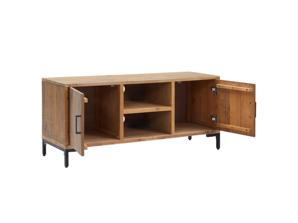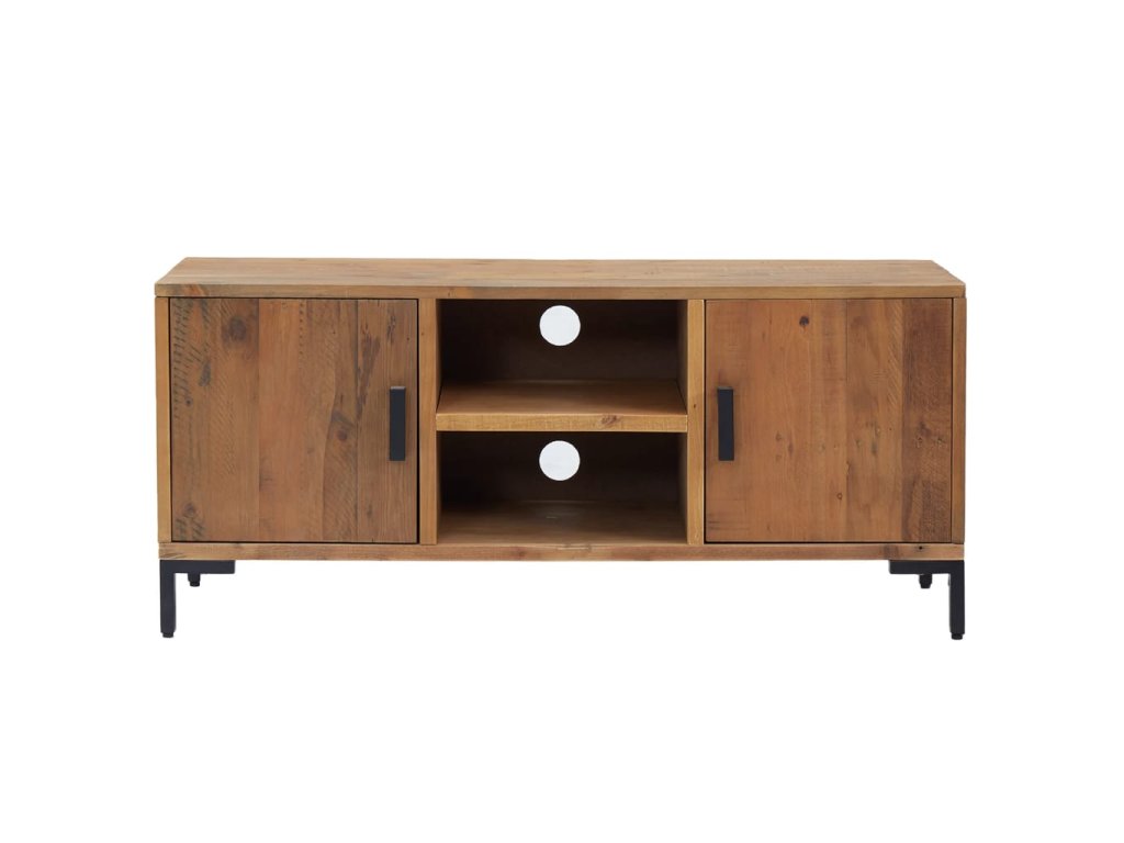 - Masivní borové dřevo: TV stolek je zhotoven z masivního borového dřeva, které vykazuje hrubé hrany, vady a škrábance, což mu dodává vintage industriální vzhled.