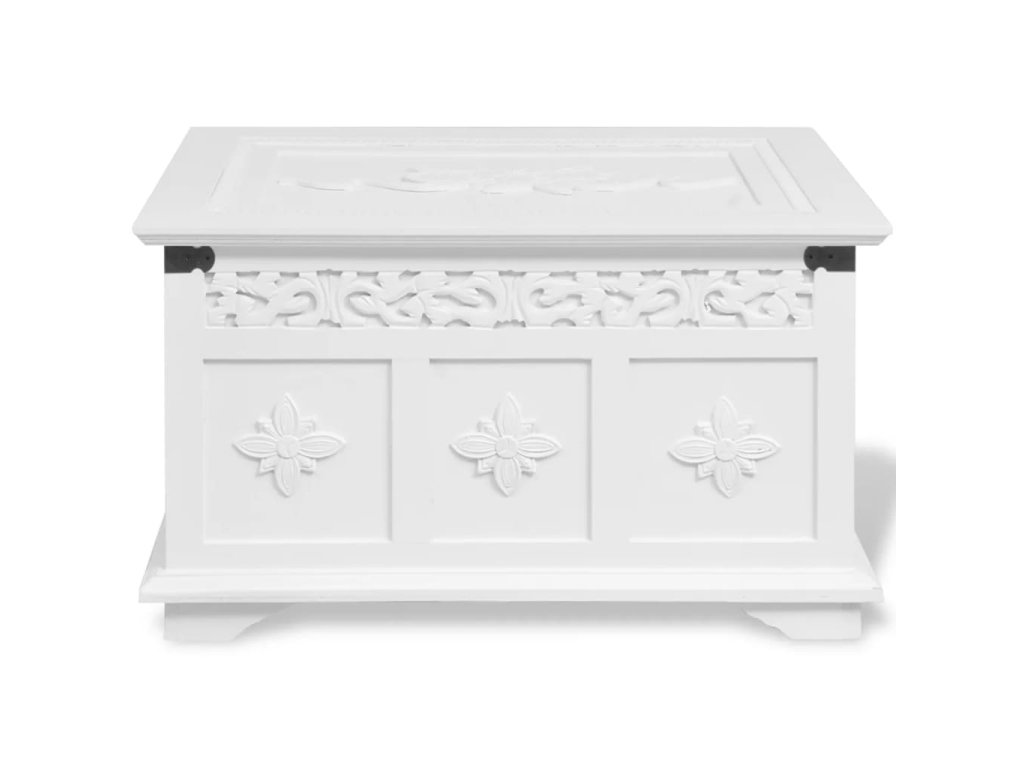 Tyto úložné truhly poskytují dostatek úložného prostoru pro textil, časopisy, knihy, hračky a další doplňky. Box s bílým lakovaným povrchem jsou vyrobeny z robustního MDF a borového dřeva, které zdobí složité ručně vyřezávané detaily. Každá truhla má po obou stranách rukojeti ve starožitném stylu a snadno se přenáší. Díky svému jedinečnému elegantnímu designu mohou být tyto truhly použity také jako konferenční stolky, odkládací stolky apod.