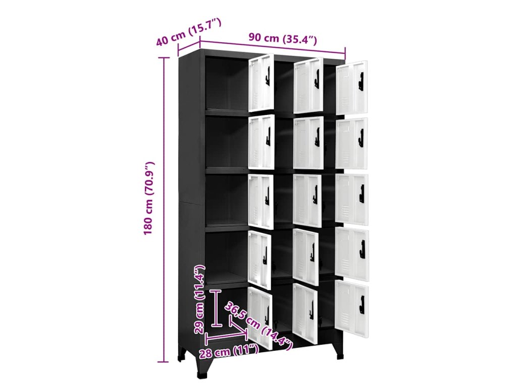 Úložná skříňka je vyrobena z oceli, proto má dlouhou životnost a snadno se čistí. Každá přihrádka je vybavena uzamykatelnými dvířky s větracími otvory. Skříň má dostatek úložného prostoru pro bezpečné uložení oblečení a dalších osobních věcí. Držáky na štítky umožňují přehledně třídit vaše položky. Tato skříň je vhodná do škol a kanceláří k uložení nejrůznějších věcí.