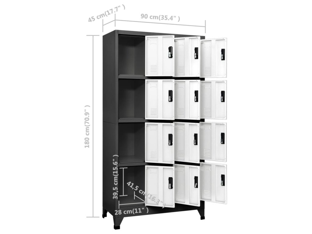 Úložná skříňka je vyrobena z oceli, proto má dlouhou životnost a snadno se čistí. Každá přihrádka je vybavena uzamykatelnými dvířky s větracími otvory. Skříň má dostatek úložného prostoru pro bezpečné uložení oblečení a dalších osobních věcí. Držáky na štítky umožňují přehledně třídit vaše položky. Tato skříň je vhodná do škol a kanceláří k uložení nejrůznějších věcí.