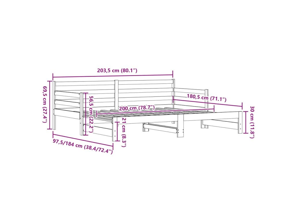 - Rozměry (nevysunuté): 203,5 x 97,5 x 69,5 cm (D x Š x V)