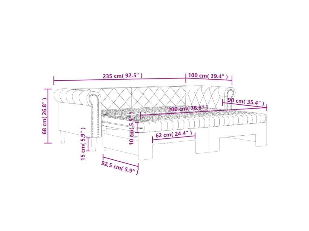- Rozměry (nevysunuté): 235 x 100 x 68 cm (D x Š x V)