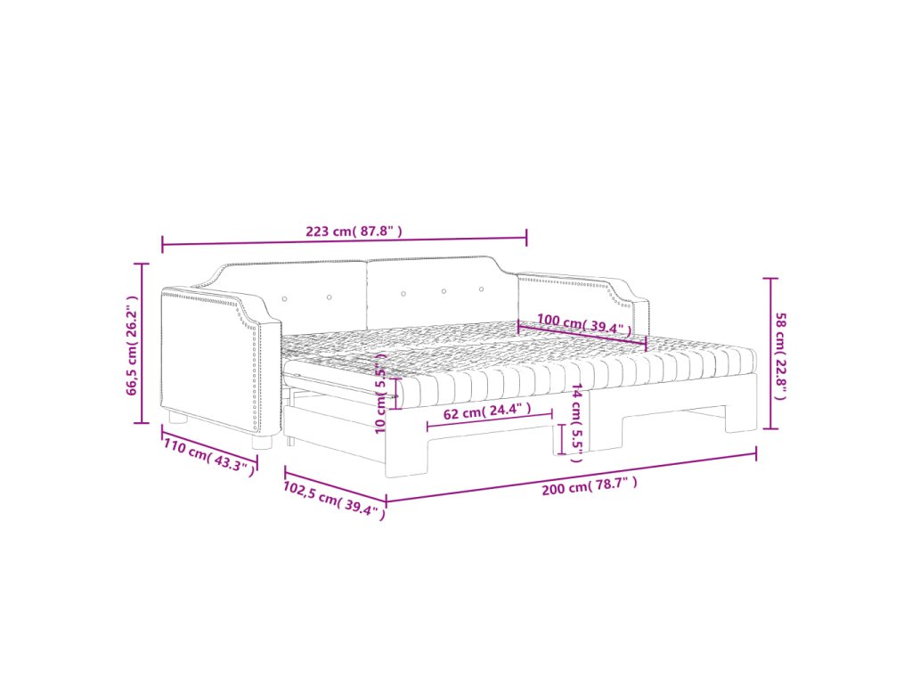 - Rozměry (nevysunuté): 223 x 110 x 66,5 cm (D x Š x V)