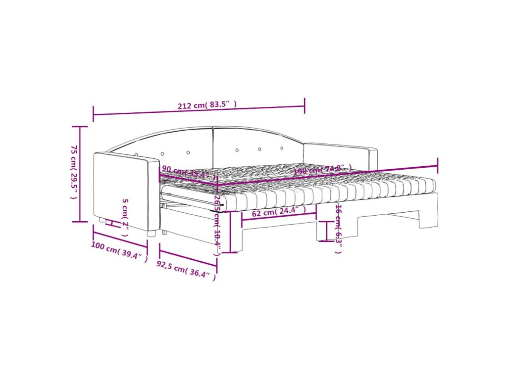 - Rozměry (nevysunuté): 212 x 100 x 75 cm (D x Š x V)