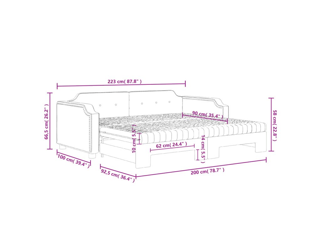 - Rozměry (nevysunuté): 223 x 100 x 66,5 cm (D x Š x V)