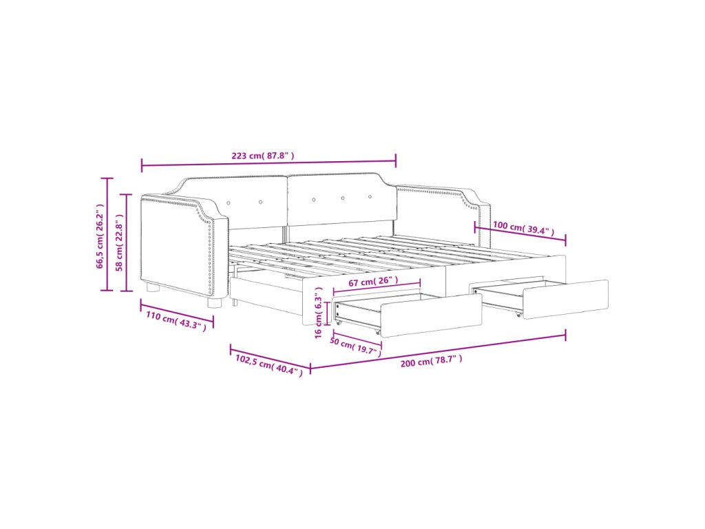 - Rozměry (nevysunuté): 223 x 110 x 66,5 cm (D x Š x V)