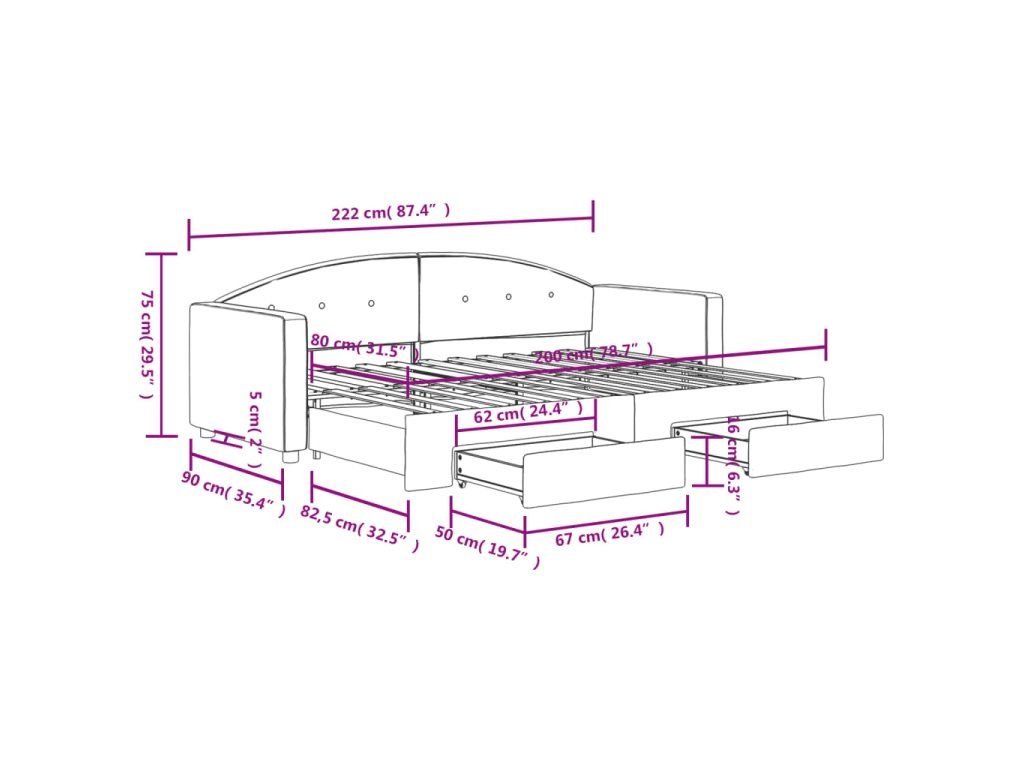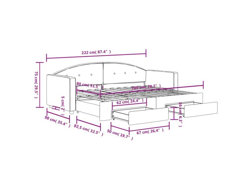 - Rozměry (nevysunuté): 222 x 90 x 75 cm (D x Š x V)