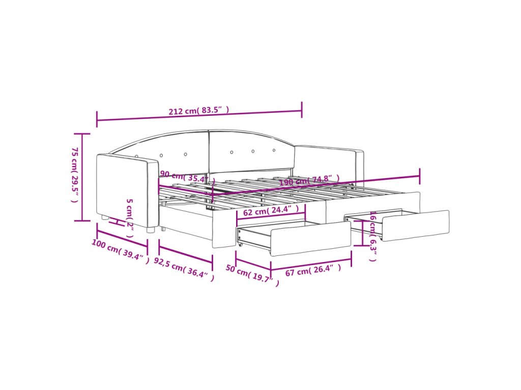 - Rozměry (nevysunuté): 212 x 100 x 75 cm (D x Š x V)