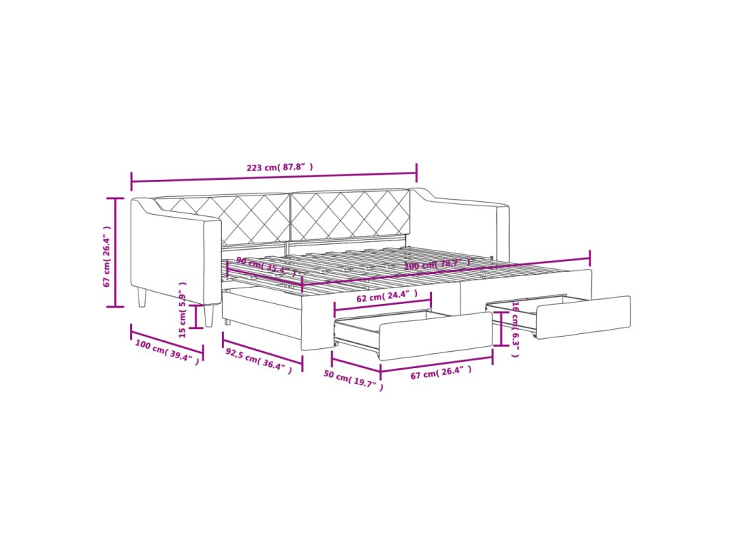 - Rozměry (nevysunuté): 223 x 100 x 67 cm (D x Š x V)