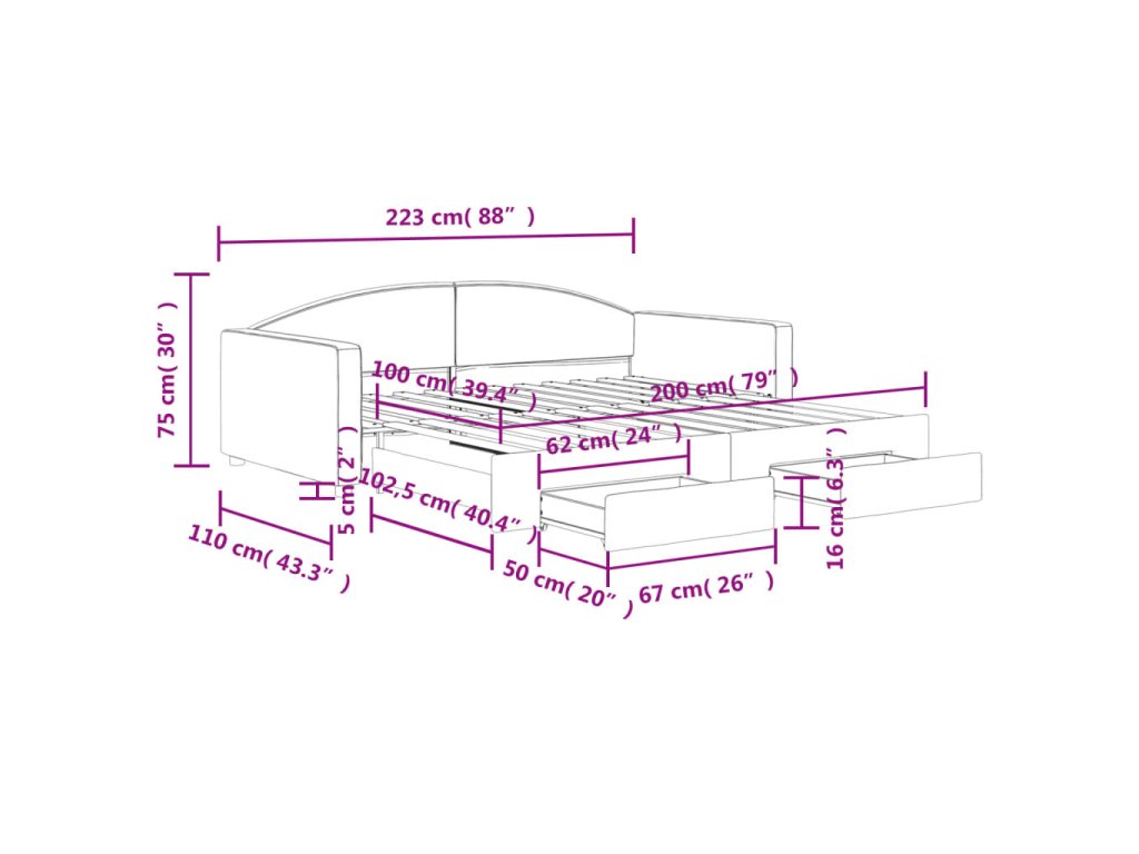 - Rozměry (nevysunuté): 223 x 110 x 75 cm (Š x H x V)