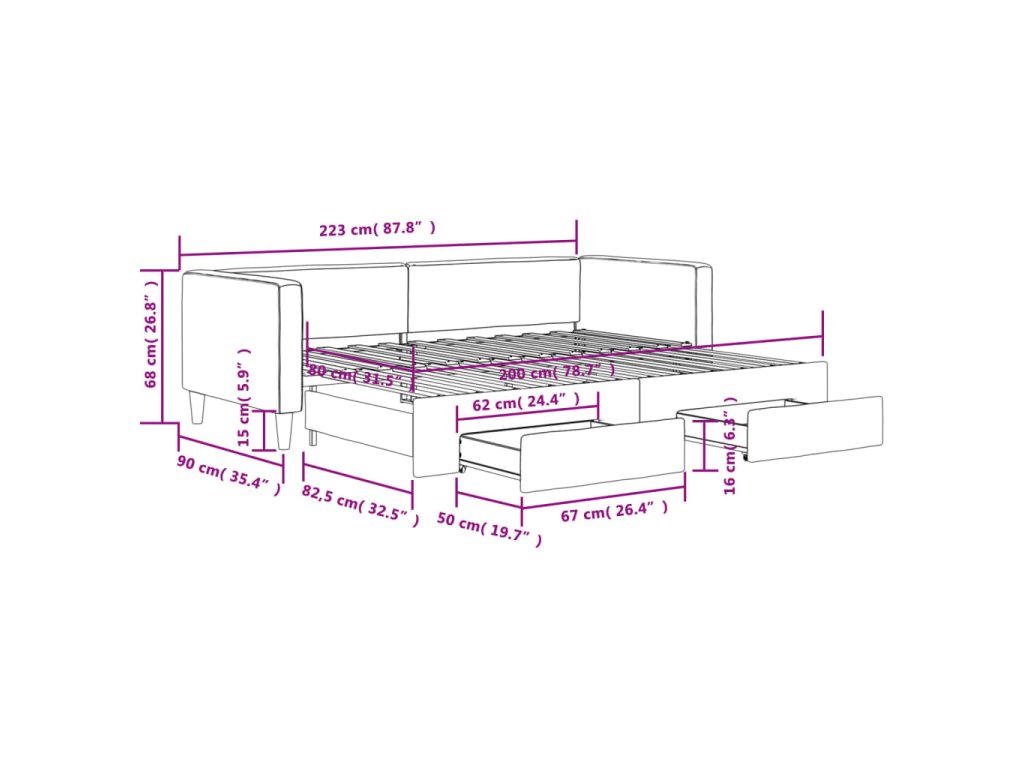 - Rozměry (nevysunuté): 223 x 90 x 68 cm (D x Š x V)