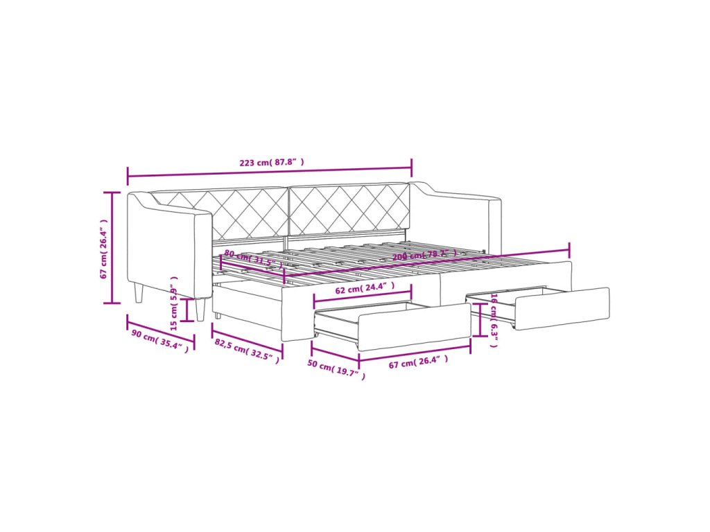- Rozměry (nevysunuté): 223 x 90 x 67 cm (D x Š x V)