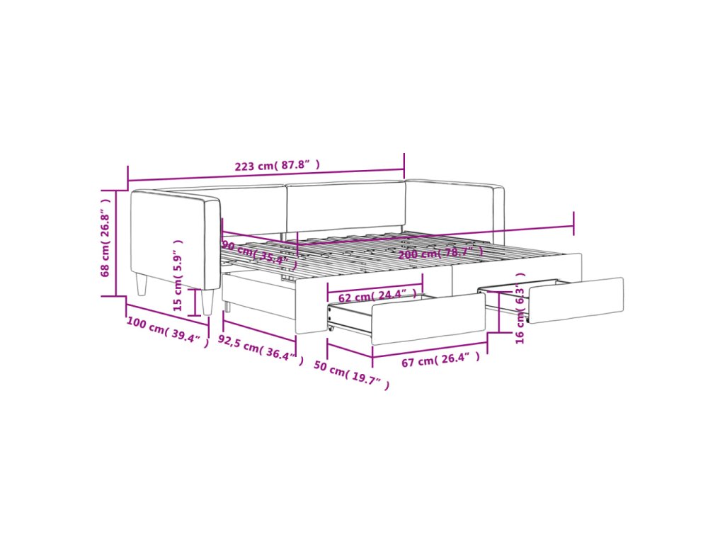 - Rozměry (nevysunuté): 223 x 100 x 68 cm (D x Š x V)