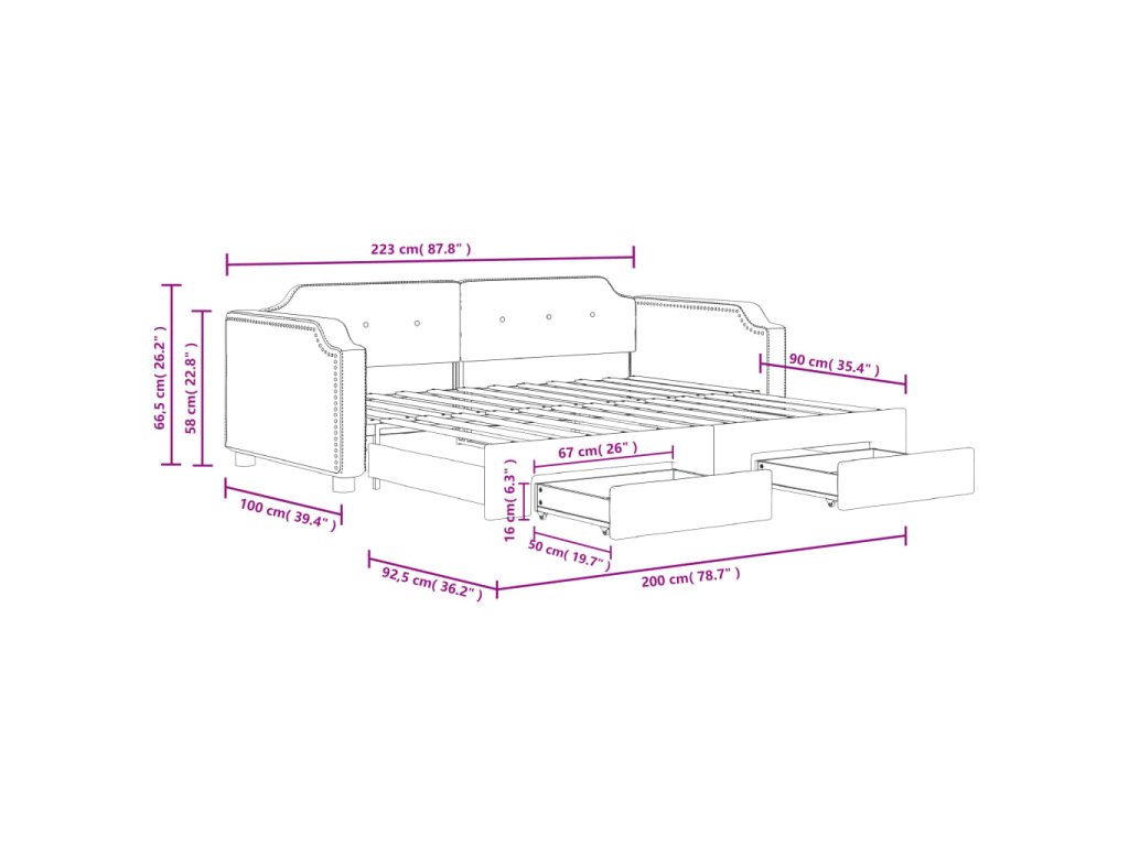 - Rozměry (nevysunuté): 223 x 100 x 66,5 cm (D x Š x V)