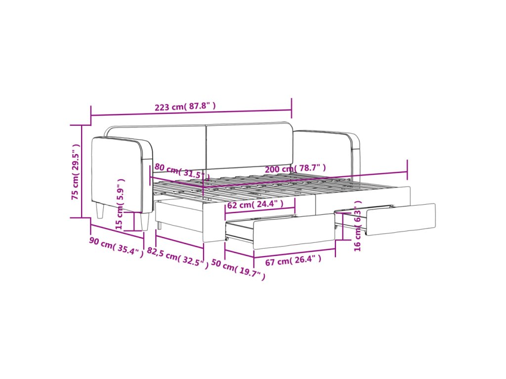 - Rozměry (nevysunuté): 223 x 90 x 75 cm (D x Š x V)