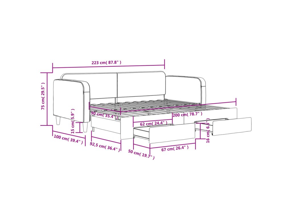 - Rozměry (nevysunuté): 223 x 100 x 75 cm (D x Š x V)
