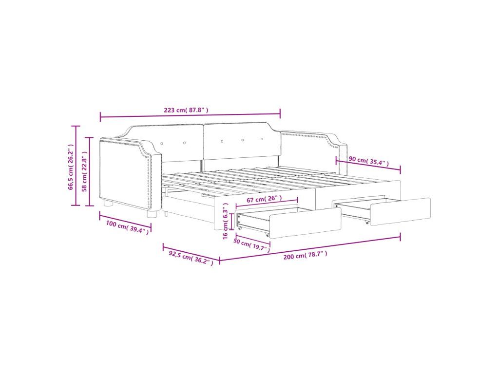 - Rozměry (nevysunuté): 223 x 100 x 66,5 cm (D x Š x V)