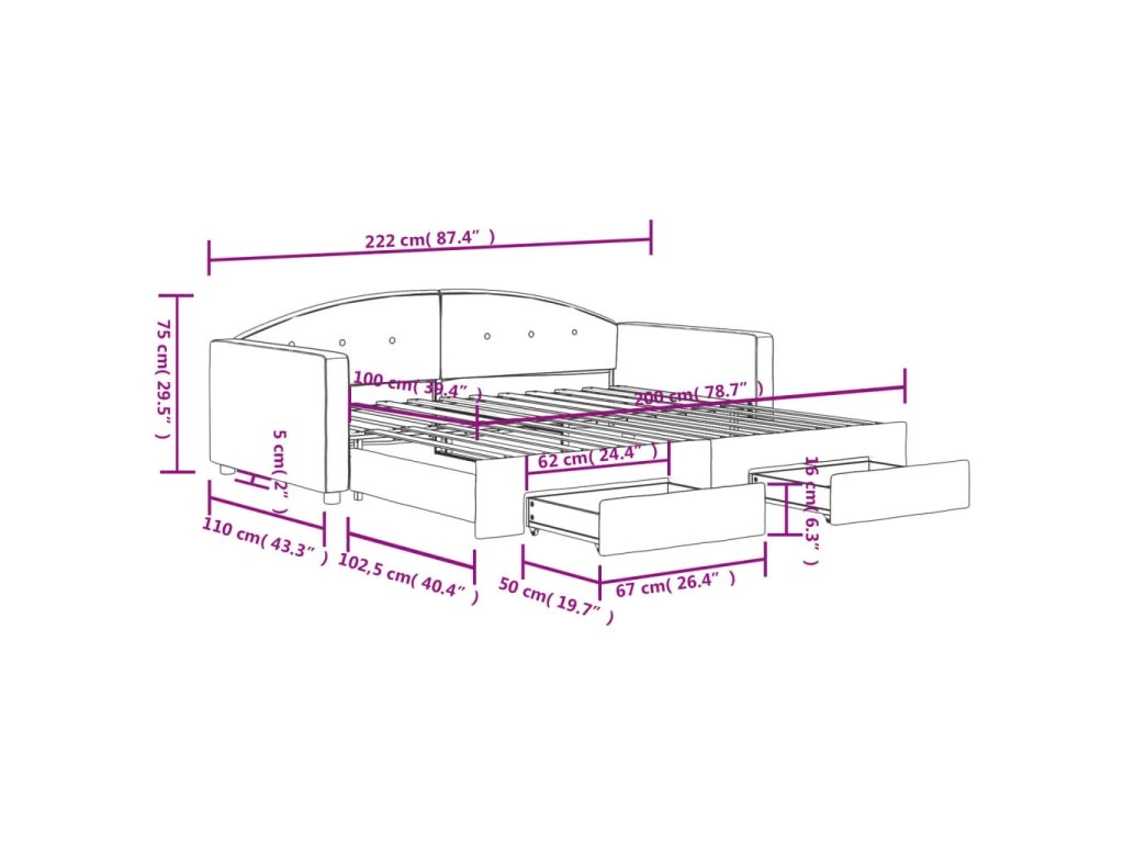 - Rozměry (nevysunuté): 222 x 110 x 75 cm (D x Š x V)