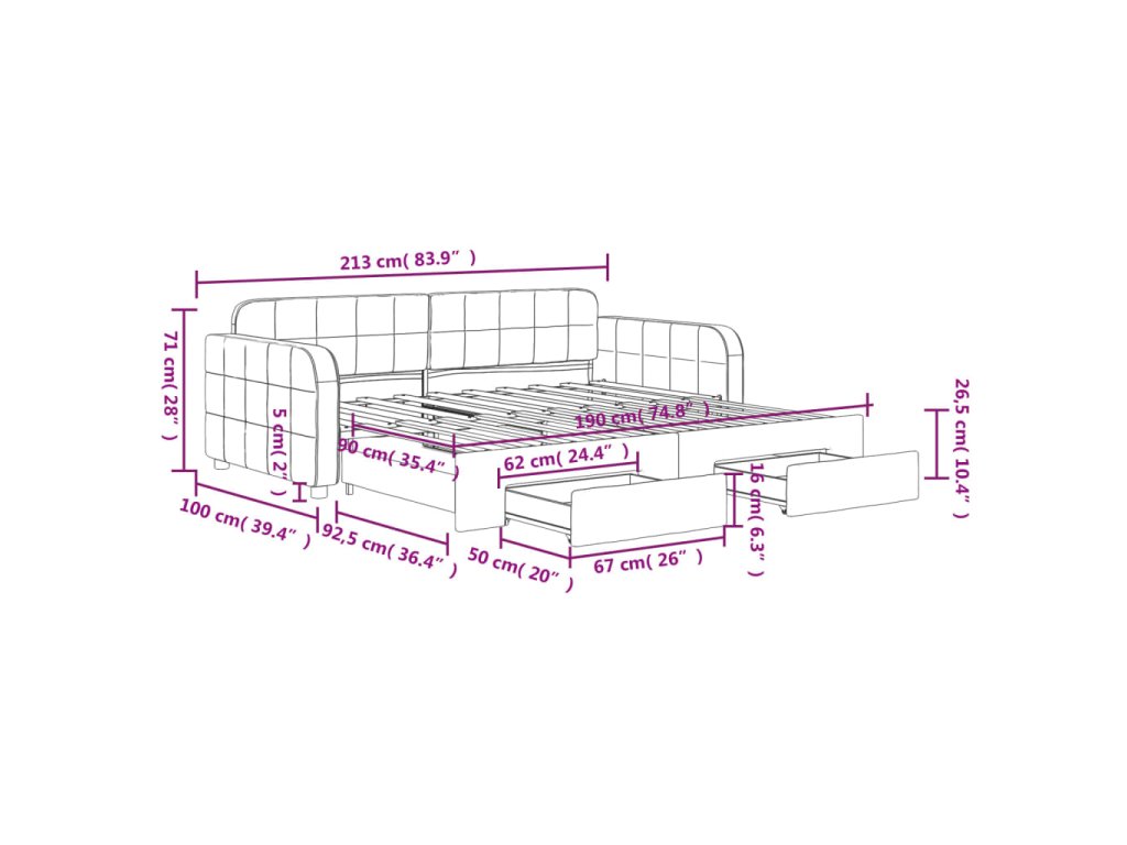 - Rozměry (nevysunuté): 213 x 100 x 71 cm (D x Š x V)