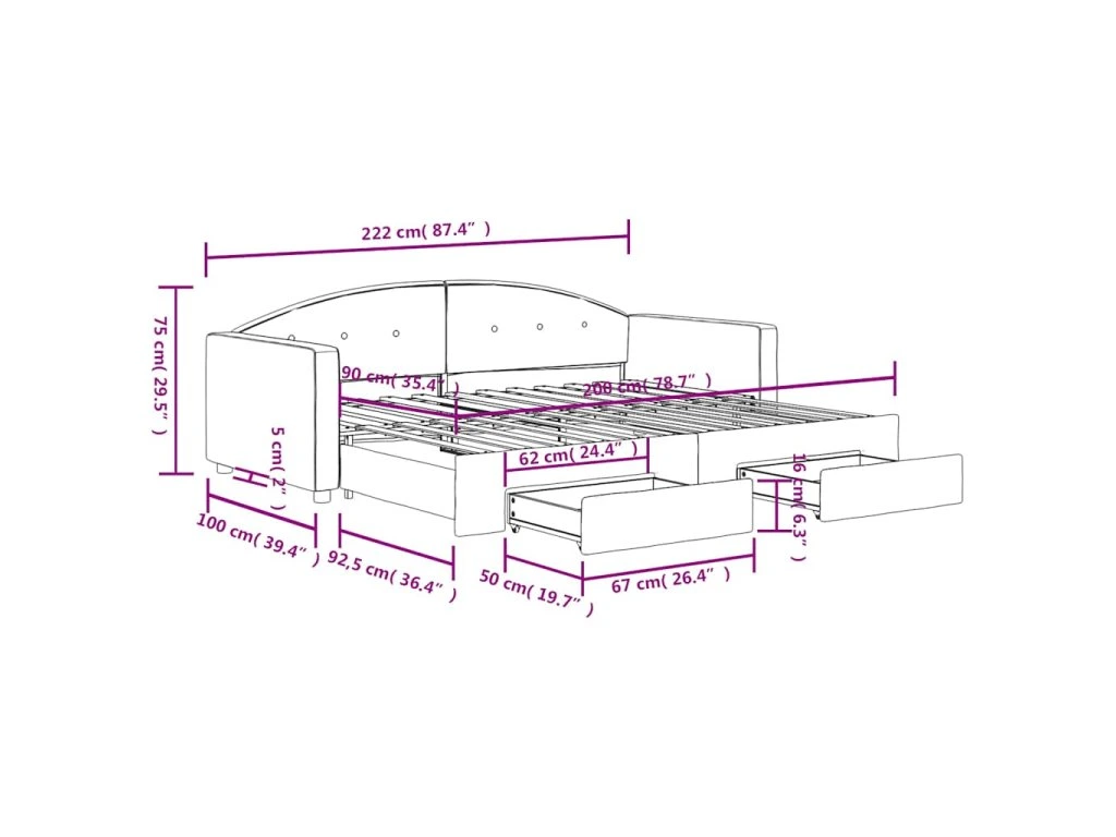 - Rozměry (nevysunuté): 222 x 100 x 75 cm (D x Š x V)