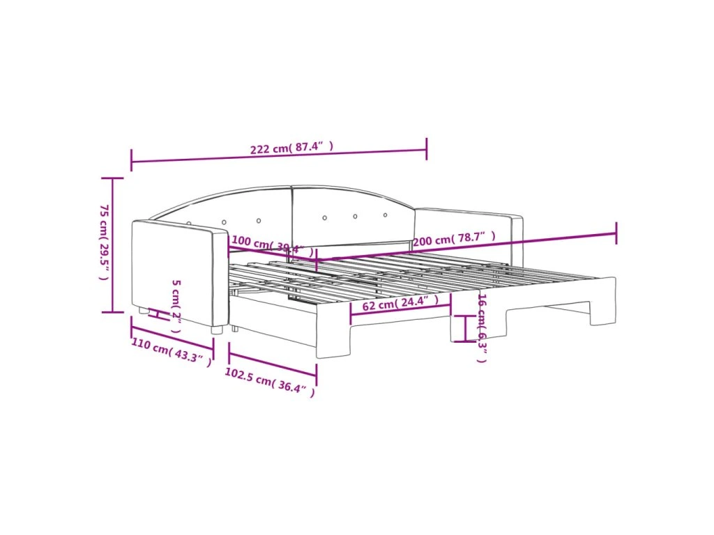 - Rozměry (nevysunuté): 222 x 110 x 75 cm (D x Š x V)