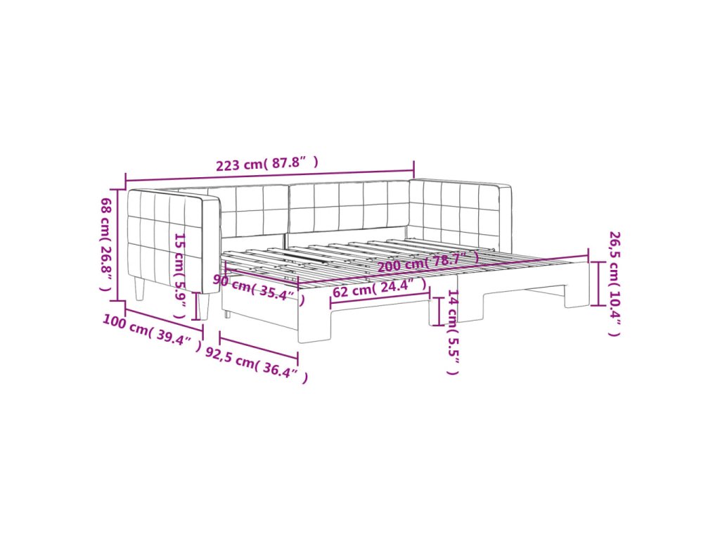 - Rozměry (nevysunuté): 223 x 100 x 68 cm (D x Š x V)
