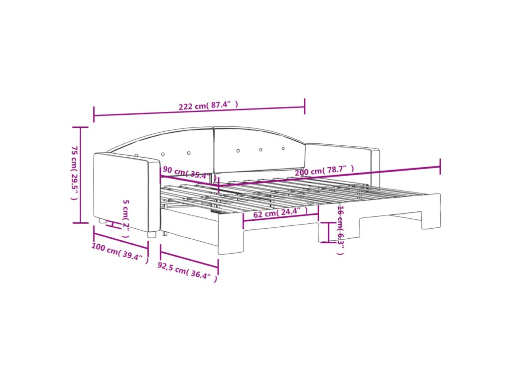 - Rozměry (nevysunuté): 222 x 100 x 75 cm (D x Š x V)