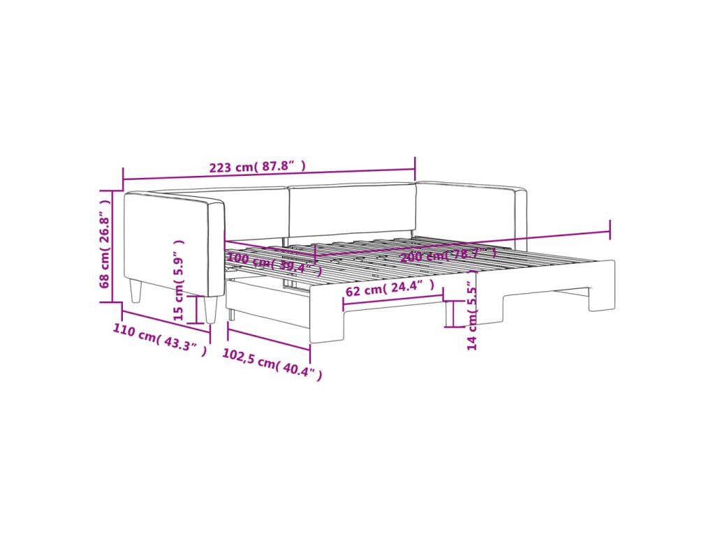 - Rozměry (nevysunuté): 223 x 110 x 68 cm (D x Š x V)