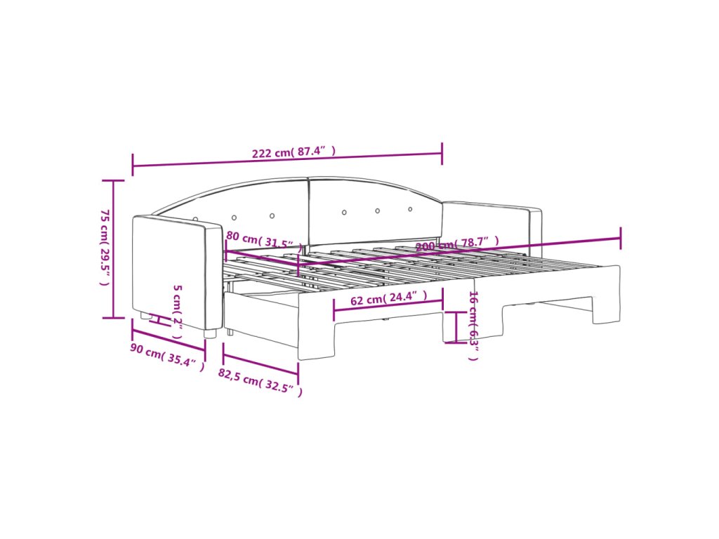 - Rozměry (nevysunuté): 222 x 90 x 75 cm (D x Š x V)