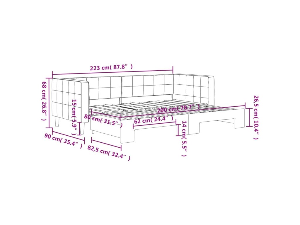 - Rozměry (nevysunuté): 223 x 90 x 68 cm (D x Š x V)