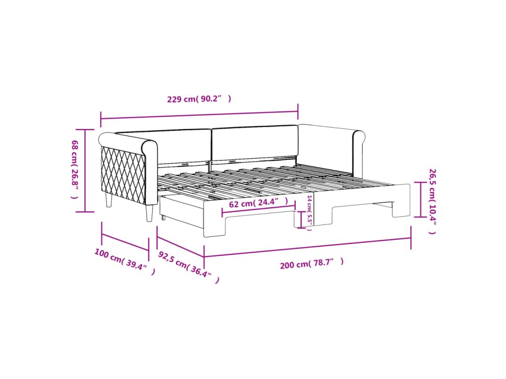 - Rozměry (nevysunuté): 229 x 100 x 68 cm (D x Š x V)