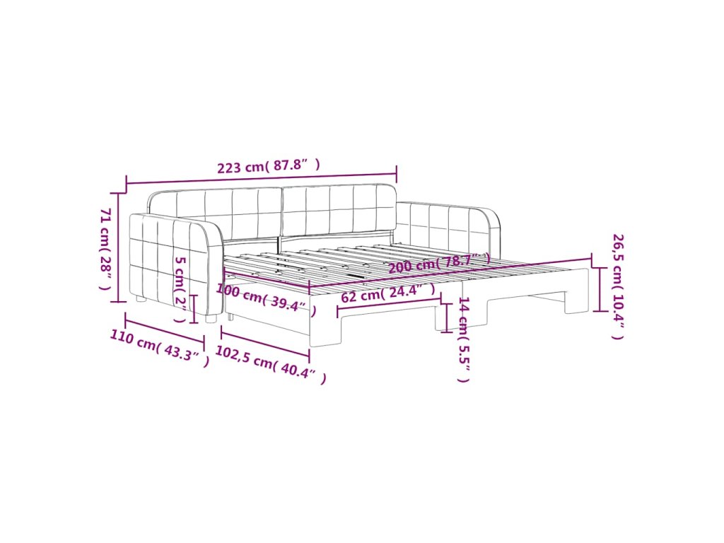 - Rozměry (nevysunuté): 223 x 110 x 71 cm (D x Š x V)