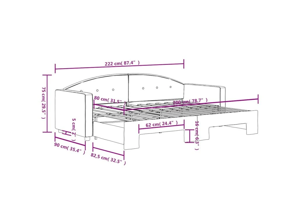 - Rozměry (nevysunuté): 222 x 90 x 75 cm (D x Š x V)