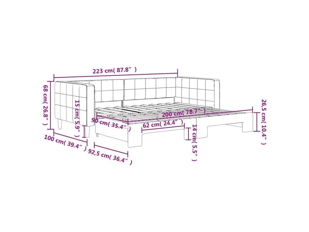 - Rozměry (nevysunuté): 223 x 100 x 68 cm (D x Š x V)