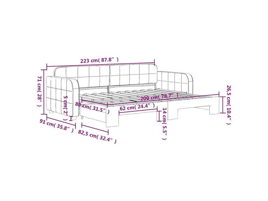 Tato denní postel 2 v 1 s výsuvnou postelí, která slouží jako pohovka i postel, je praktickým a poutavým doplňkem vašeho obývacího pokoje nebo ložnice.