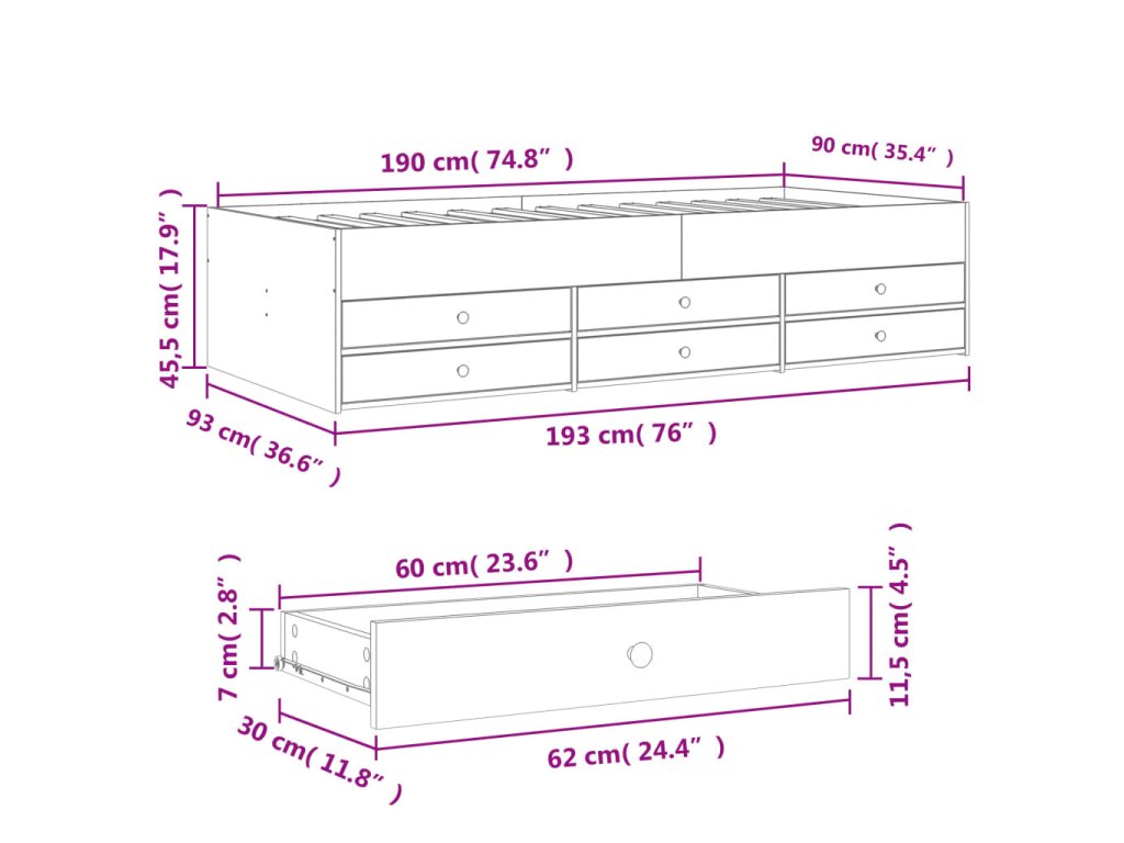 Válenda se zásuvkami bez matrace kouřový dub 90 x 190 cm 3280885