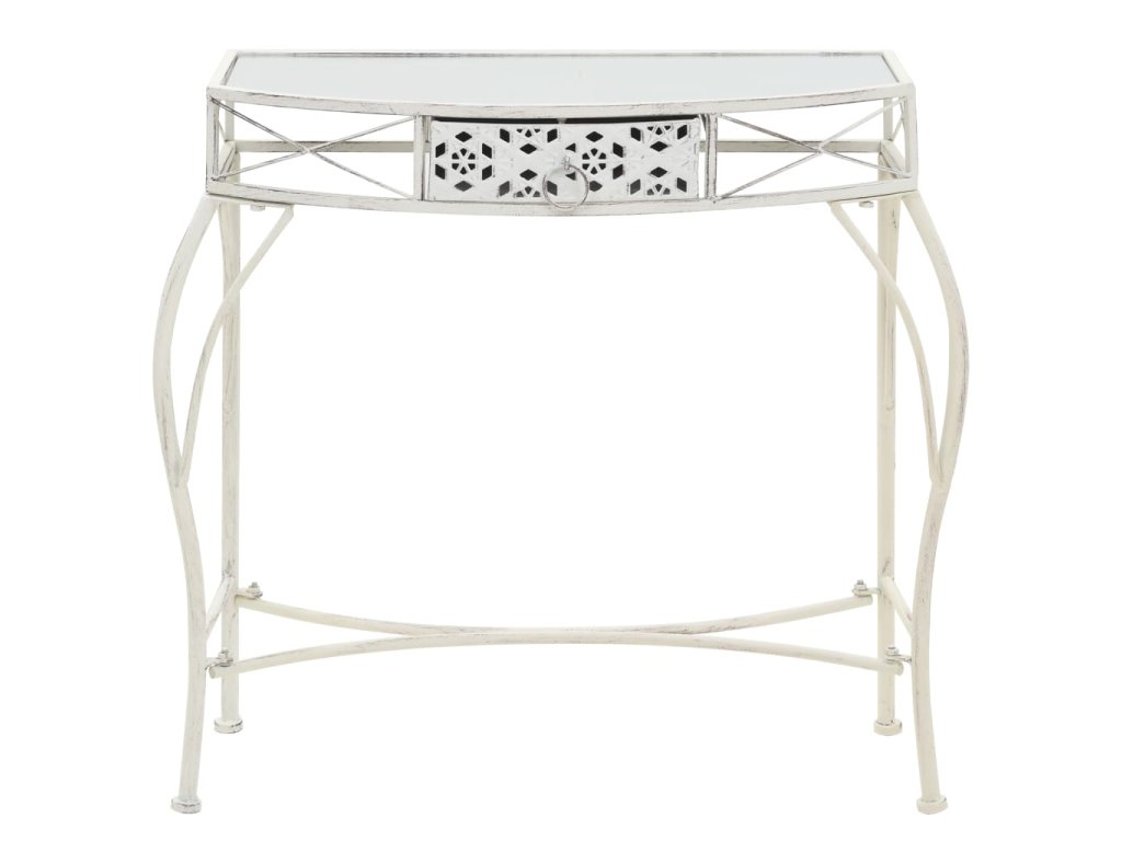 Stolek má kovový rám a skleněnou stolní desku, je stabilní a snadno se čistí. Odkládací stolek disponuje zásuvkou, která je zdobená vkusnými ornamenty, jež stolku propůjčují starožitný vzhled a vnesou do vašeho domova nádech elegance. Montáž výrobku je snadná.