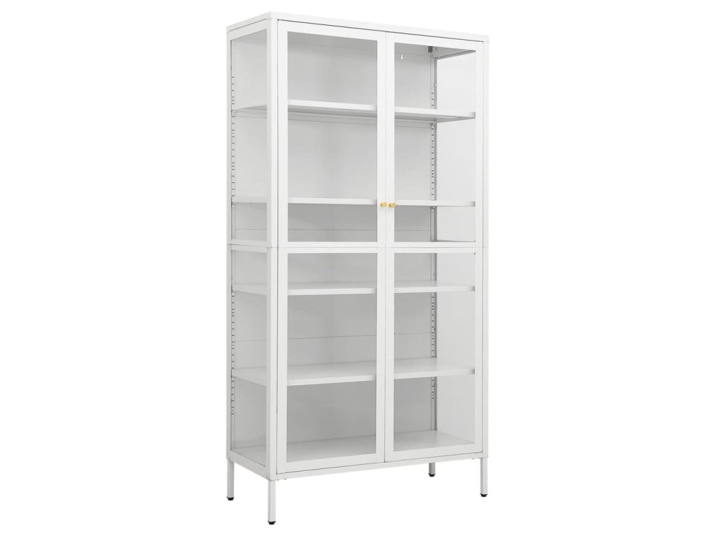 Úložná skříň je vyrobena z oceli a tvrzeného skla, takže je robustní a odolná a zajišťuje roky používání. K dispozici máte 4 nastavitelné police, které poskytují dostatek prostoru pro uložení knih, časopisů a dalších osobních nezbytností. Navíc se snadno čistí vlhkým hadříkem.