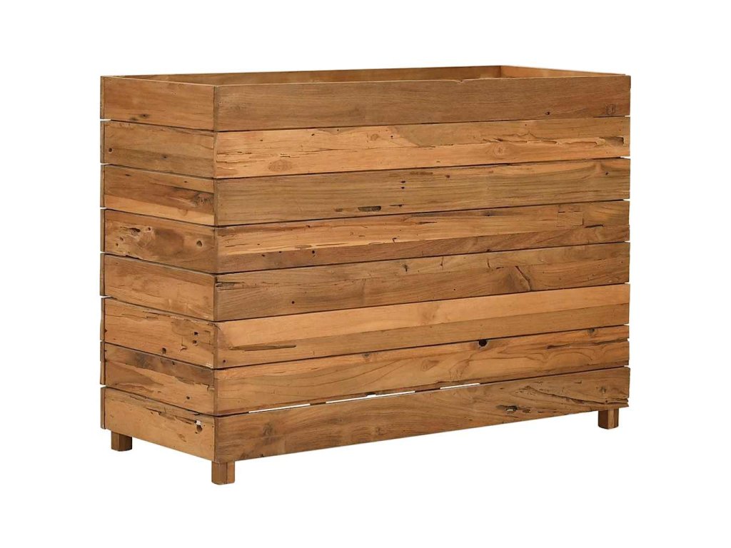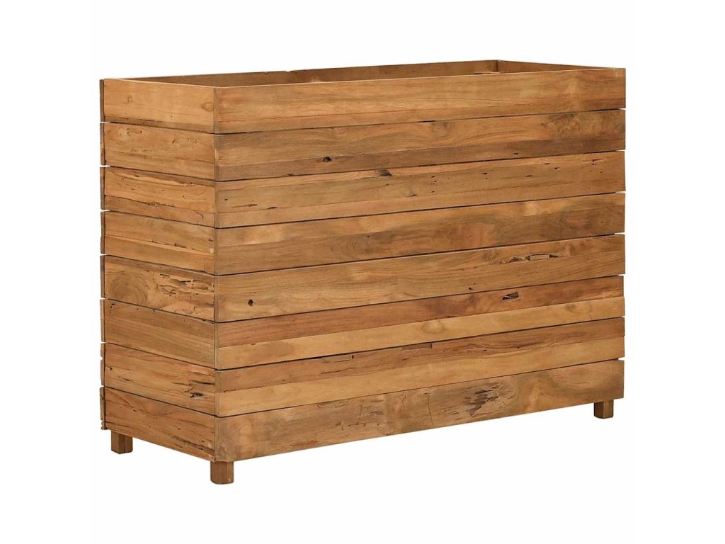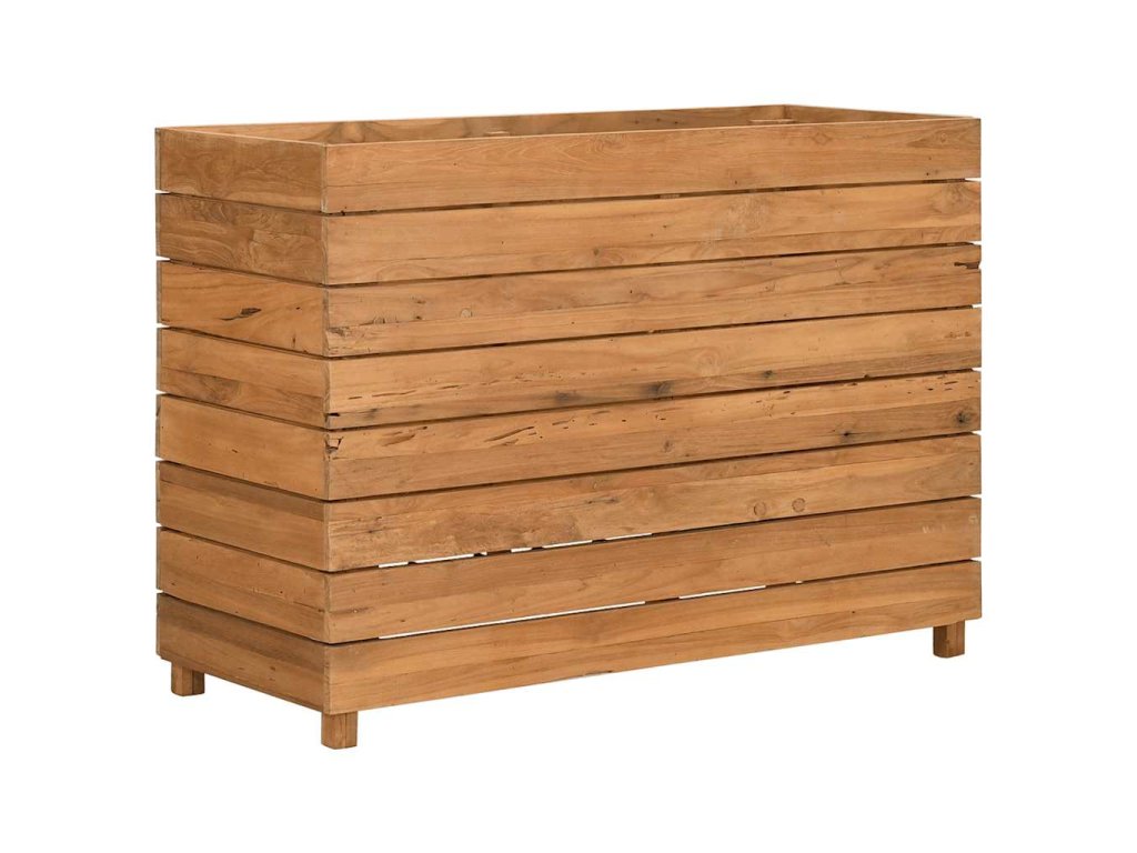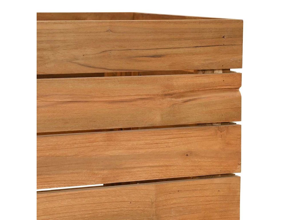 Truhlík je vyrobený z recyklovaného teaku, je tudíž velmi robustní a má dlouhou životnost. Krásná kresba dřeva je vždy jedinečná, a proto je i každý truhlík originální kus, lehce odlišný od všech ostatních. Čtyři dřevěné nohy zlepšují jeho stabilitu. Dno truhlíku je dále vybavené ocelovou podložkou, kterou lze umístit do 2 různých úrovní, takže si snadno zvolíte výšku pro vaše květináče. Sestavení tohoto produktu je jednoduché.