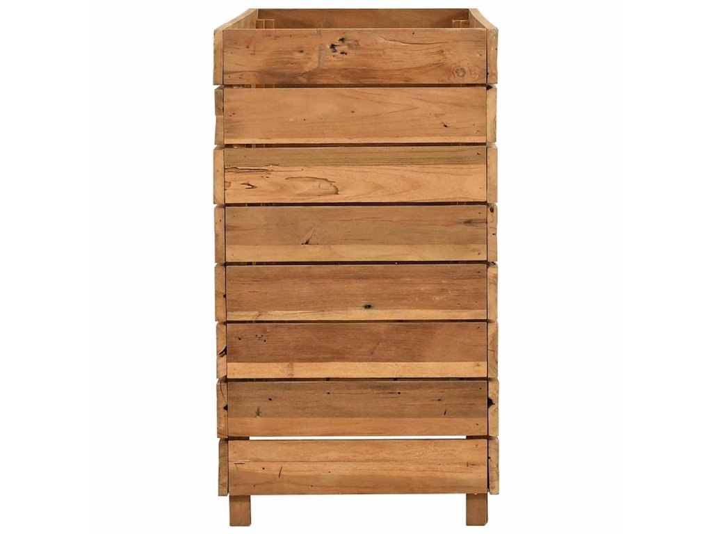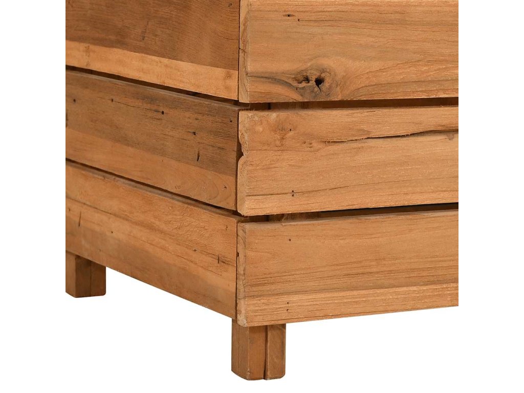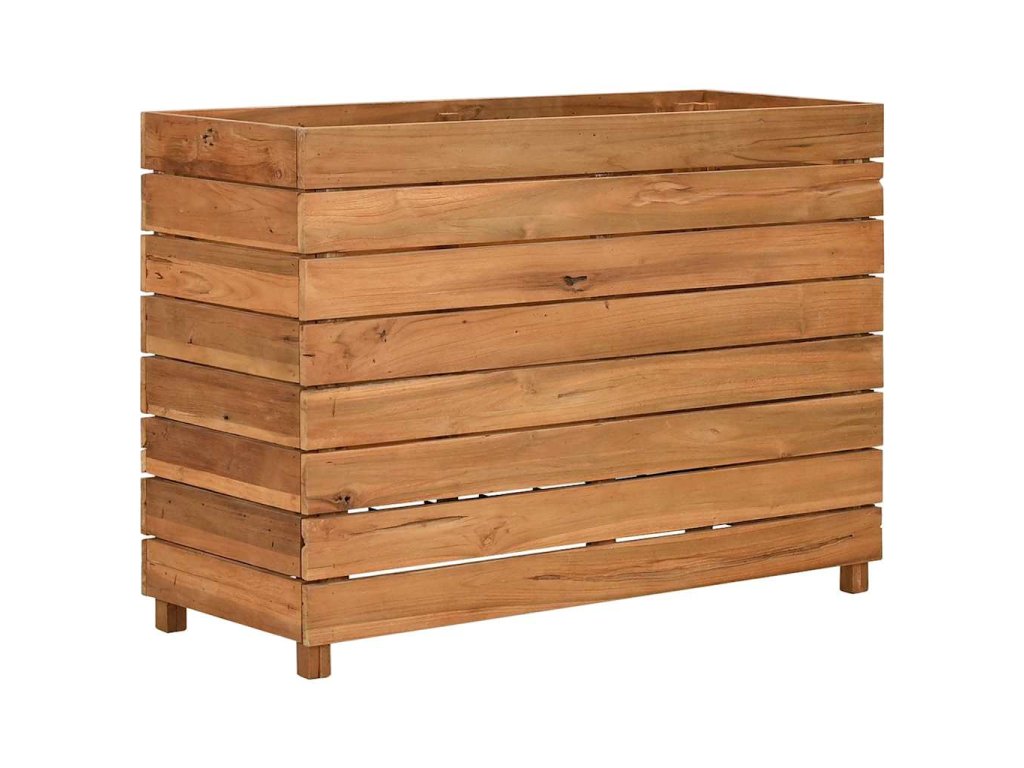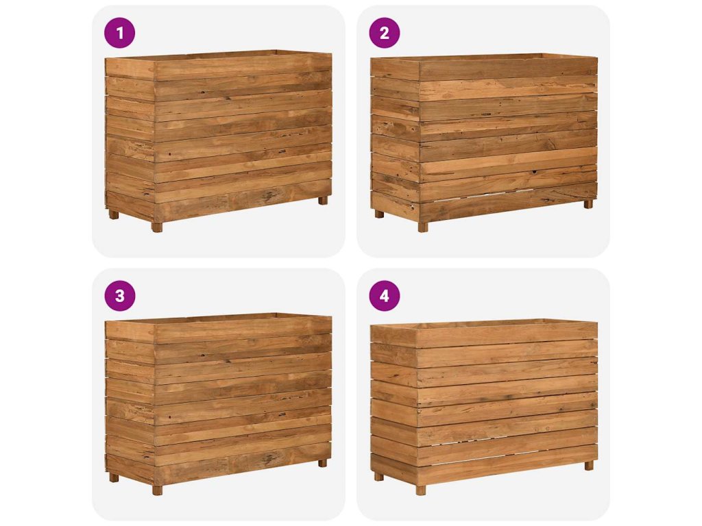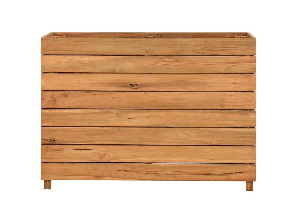 Truhlík je vyrobený z recyklovaného teaku, je tudíž velmi robustní a má dlouhou životnost. Krásná kresba dřeva je vždy jedinečná, a proto je i každý truhlík originální kus, lehce odlišný od všech ostatních. Čtyři dřevěné nohy zlepšují jeho stabilitu. Dno truhlíku je dále vybavené ocelovou podložkou, kterou lze umístit do 2 různých úrovní, takže si snadno zvolíte výšku pro vaše květináče. Sestavení tohoto produktu je jednoduché.
